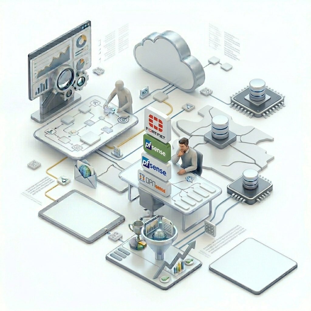 Configuring Fortinet (FortiGate), pfSense, or OPNsense involves setting up network interfaces (WAN/LAN), defining firewall rules, and enabling services like DHCP. FortiGate is a enterprise-grade NGFW, while pfSense and OPNsense are versatile, open-source options ideal for software-based setups, both managed via web GUIs.